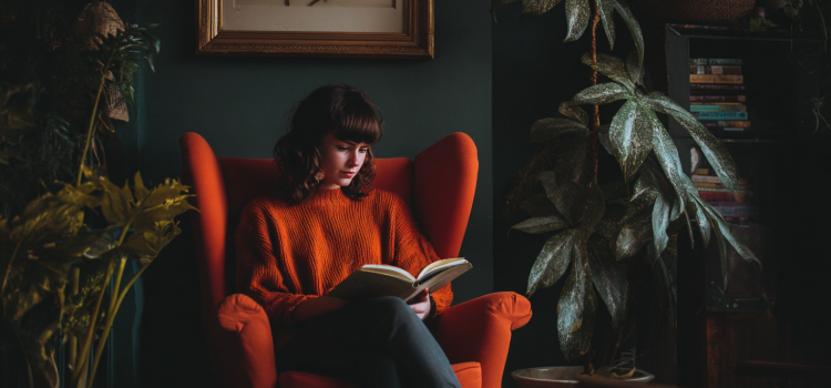 Eine junge Frau liest ein Buch, während sie auf einem Stuhl neben einer Lampe sitzt